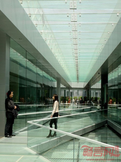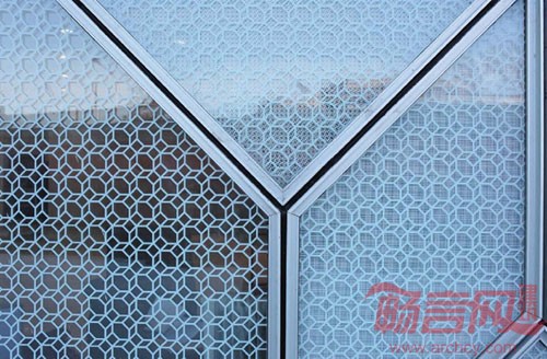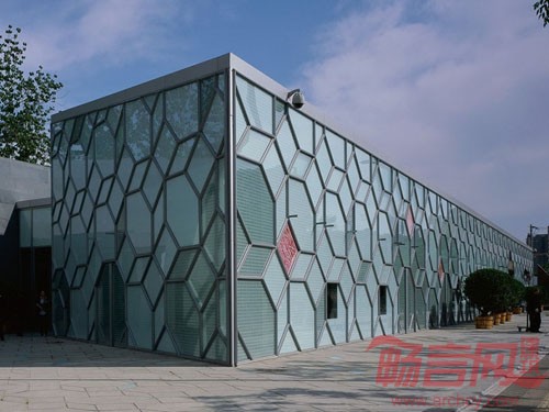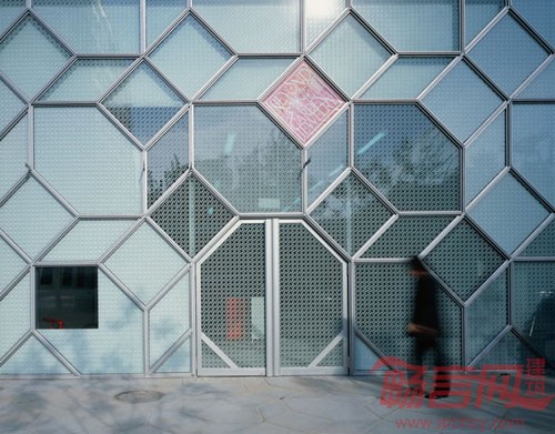 对应于白云观自身的中轴线,是一道微折成“V”字型的、约140米长的现代玻璃影壁墙,它折射了道观的重重庭院。其立面构图是道教八角卦形图案的变形,由此衍生出可以组合成门、窗、橱窗、灯箱、不透明墙体等的复杂幕墙体系,既有功能的合理性和视觉的美感,又有文化的厚度,从而以轻松又有力度的现代构图应对古观的凝重。