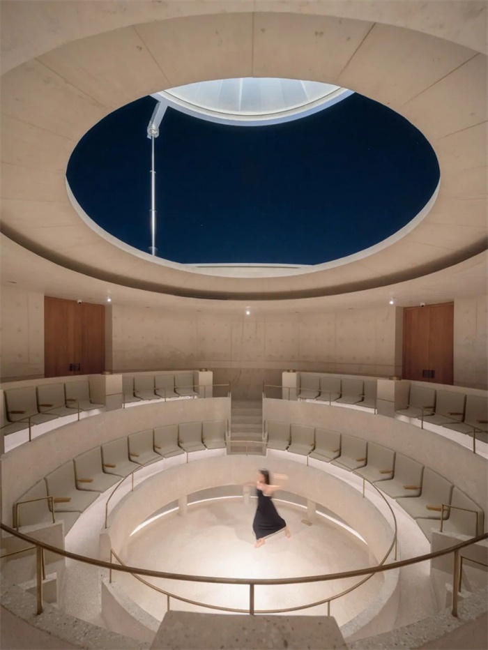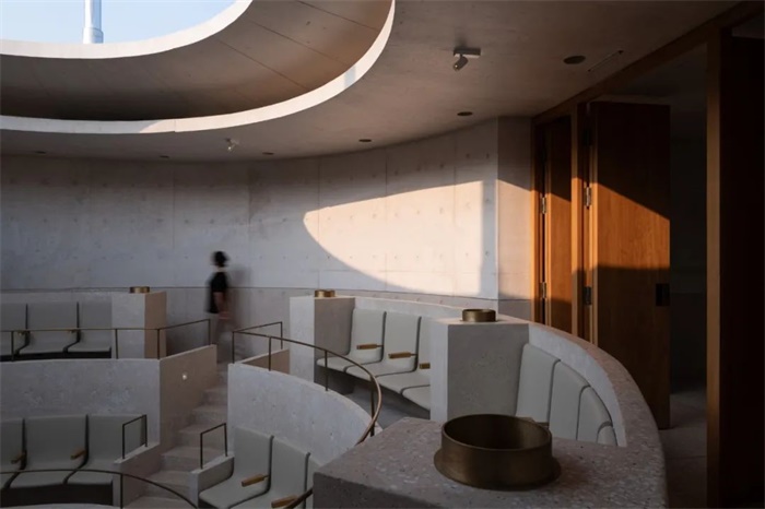位于首层的冥想圆厅高9米,弧墙与地面在墙角处留有一圈50厘米宽的开启扇,空气可上下流通,漫射的自然光同时从墙角和悬浮圆盘四周的缝隙渗入。由混凝土浇筑而成的座位环绕圆厅布置,形如躺椅,人们可自然后仰,感受音乐、自然光和风在空间穿透和弥漫。
