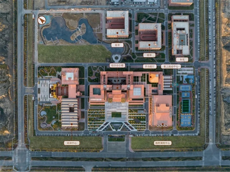 项目位于陕西榆林榆神工业区清水工业园,坐落于一片远离市区的荒漠之中,周边被工业园区所包围。设计意图将此打造为一座可以漫步其间的微城市,这里不仅是办公空间,更是供厂前区职工共享、交流、生活的场所,为生活在这里的使用者提供人文关怀。