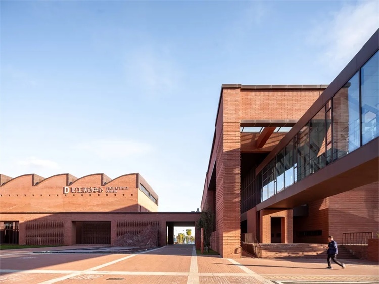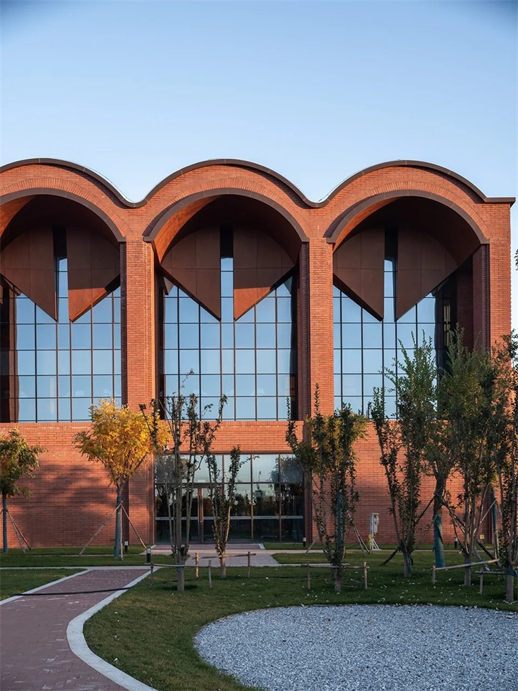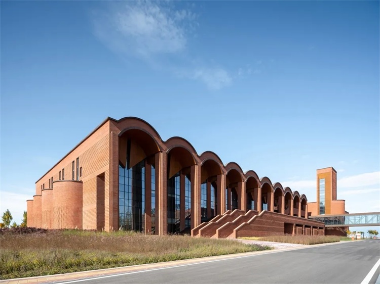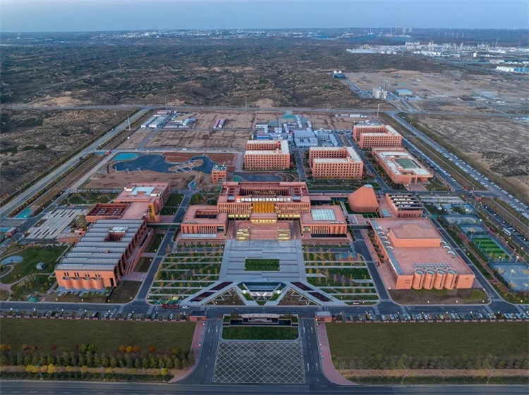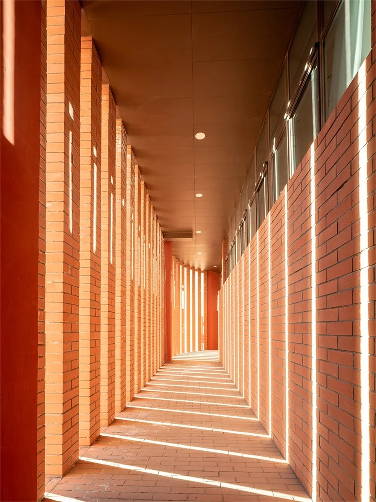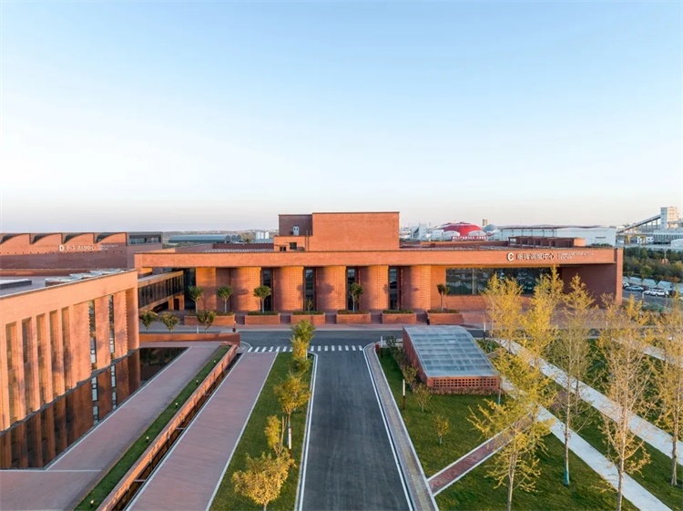 室外主广场、大型庭院与各个楼的核心空间形成了连续的空间路径。主入口处的礼仪广场由三栋建筑围合而成,可用于组织大型仪式活动。西侧的塔作为视线指引,引导人们漫步至北侧区域。穿过东侧建筑之间的连廊,会来到由建筑围合成的小型广场,可以遮蔽风沙的微环境更加适于人们在此休憩交流。走过有天窗的办公楼走廊,感受“筒仓”顶部落下的天光,这些工业元素不仅是传统工业建筑的回忆,更是结合自然通风与采光,有效实现绿色节能的建筑空间。
