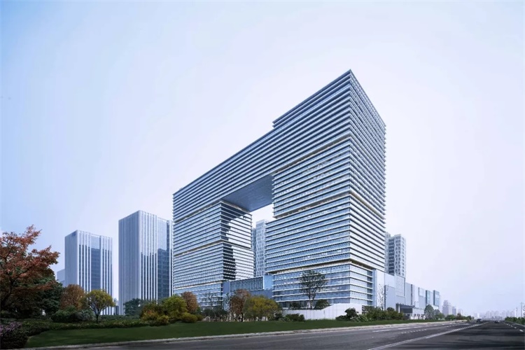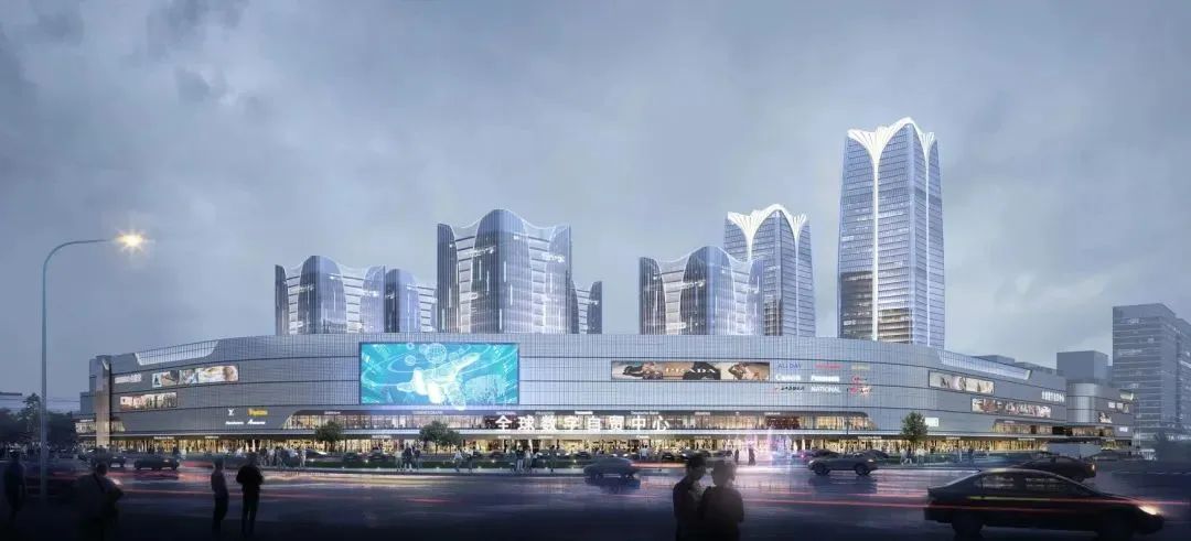 项目规划采用“一心两环”的中心式总图布局,外部以市场商贸环承接西侧国际商贸城五区、沿市政道路界面延续市场形象,内部以商办活力环加中心数字大脑打造聚核心、汇人气的24h生活贸易综合圈。外围市场商贸环布局四大市场板块,内部商办活力环由七栋写字楼及飘带式的商业裙房环抱中心数字大脑组成,七栋办公楼由70m逐步攀升至100m,位于基地东侧的两栋双子塔成为城市天际线制高点,整体形象呈现七星还珠、步步升腾的态势,打造义乌城市新地标。