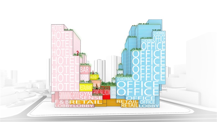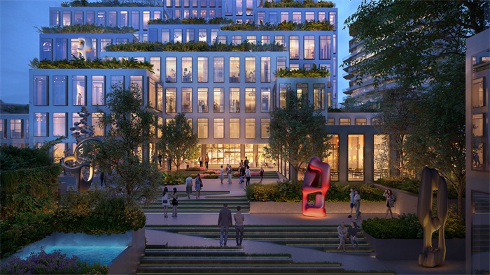 连接两座塔楼的“城市峡谷”将是一个互动空间,汇集了两座塔楼的协同元素,如宴会厅、会议空间、酒吧和餐厅、零售,以及展示艺术作品的空间和露台。自动扶梯网络实现了各种功能之间无缝的垂直和水平循环,同时与更广阔的开发和总体规划的中央公共脊柱相连接。