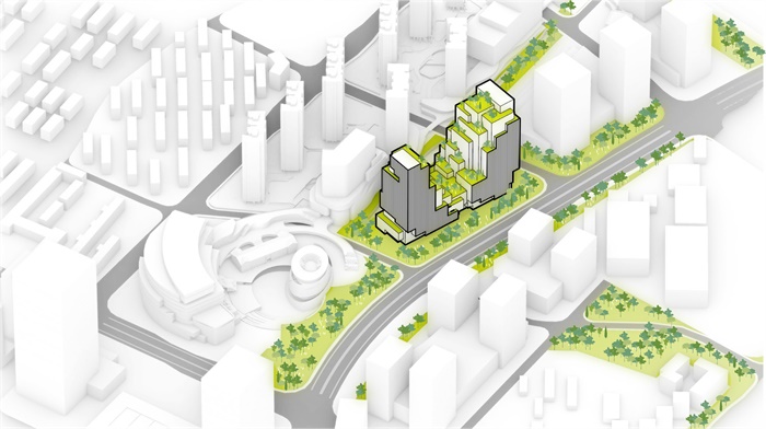 受杭州代表性绿色丘陵景观的启发,奥雷·舍人的设计将自然元素贯穿整个项目。一系列层层叠叠的阶梯式体量营造出“城市峡谷 ”的三维景观,为新世界集团的艺术和雕塑收藏提供了展示舞台。交织的露台和绿地最大限度地为两座塔楼的提供自然采光,同时在室内外空间之间建立起视觉联系。酒店顾客、办公人员和公众都可以进入这个三维雕塑花园,促进丰富的文化体验。
