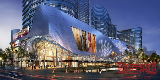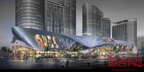 船身下部为波浪造型、网型镜面玻璃及金属的钢结构雨棚产生波光粼粼的效果,在主要的西南角及南向中央商场主入口处形成较大波浪创造入口形象吸引人流;船身尾部(东段)为蓝色折线玻璃幕墙系统象征航行卷起的层层波浪;商场底部沿街复式商业立面采用高透玻璃幕墙,为商家提供最大的橱窗空间,并给行人增加时尚橱窗购物的趣味。