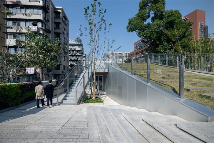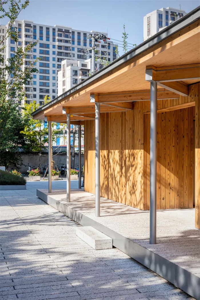 从星空剧场向北回望,以公共卫生间的绿植屋顶为前景,正好望向作为普陀区城市地标的环球港双塔。口袋公园的南北穿行路径蜿蜒曲折,宽窄变化,一侧由驿站长长的水平檐廊限定,一侧是衬有绿植墙的小区围墙及花坛,间隔设置休息座椅。通道南端稍放大为一处小广场,以坡道及变幻的台阶与略高的滨河绿道相接,并有一部略偏西南的直跑楼梯通往天台花园,楼梯上半段与绿坡屋顶夹角处稍放宽为可坐人的面河台阶。