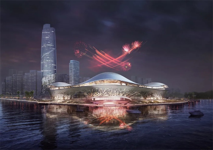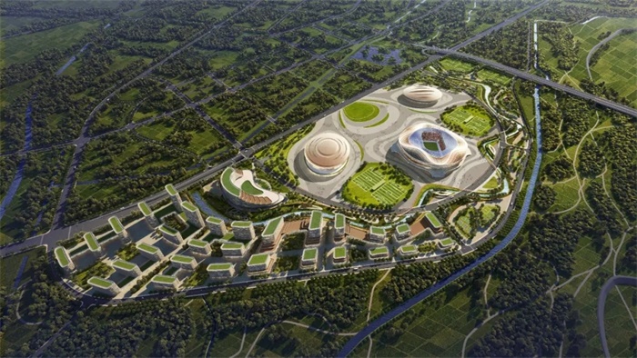 项目由北京市建筑设计研究院(牵头方)携手HPP建筑事务所共同设计。黄河体育中心城市设计立意源自黄河,采用圈层式结构,取黄河九曲之神韵,打造“一轴三环”的空间结构,呈现黄河形态、历史和精神。方案尊重济南段黄河以北发展现状,继承城市格局中山水的对话关系。