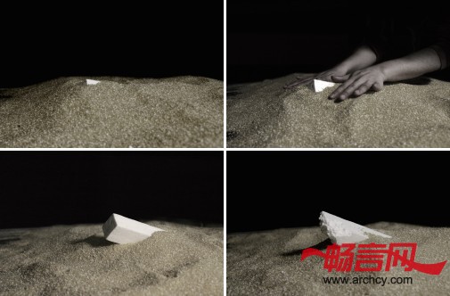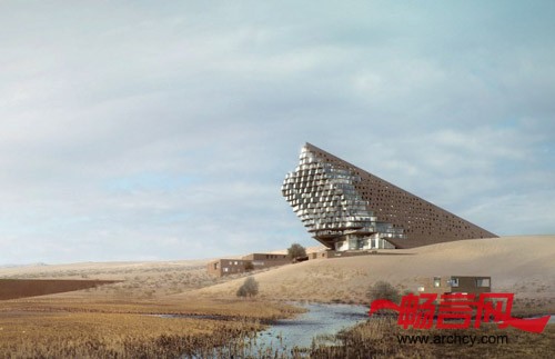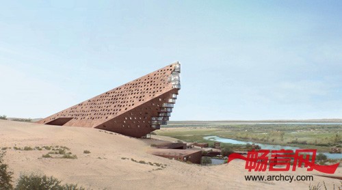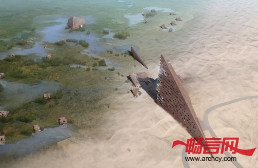 “站在基地上我们看到的是一望无际的沙漠与生机盎然的黄河湿地的强烈对比关系”建筑师于基地调研时感受到位于对比强烈的环境下建筑应与环境交相辉映,互相强化,如同大漠中耸立的金字塔一样,建筑体量应是及其几何化,能够在空旷视野中成为打破地平线而又能与地貌融合为一的形态。建筑概念由此而生——一块砾石从大地中破土而出,经日夜风吹雨打而风化后立于基地之上。