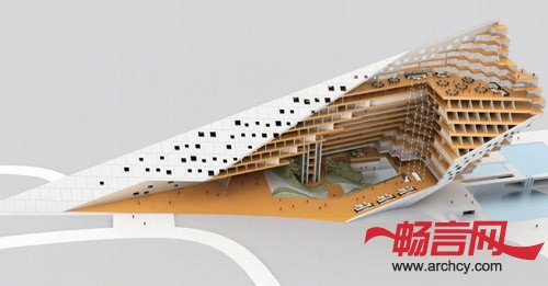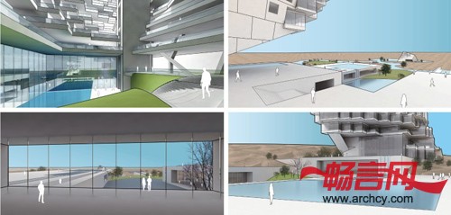 在建筑远眺黄河及黄河滩湿地的基地环境条件下,主题酒店的设计试图达到观景最优的标准,内部的大厅与外部景观是相连接的,使景观内外呼应,酒店最佳观景面上外壳透明且低能耗,形体层叠而上如宝石般引人注目。被提升到建筑最高点的行政酒廊是高端的集会场所,在这里俯瞰湿地沙漠景观的交汇,并可远眺黄河远去。给人创造了一个振奋人心的场所。会议中心,会展中心,宴会厅依坡而建,与景观自然结合的同时满足功能的需求。