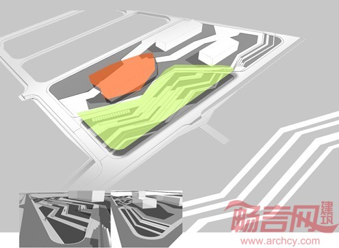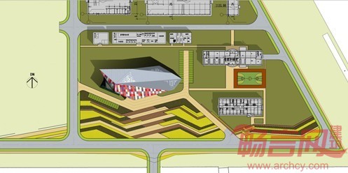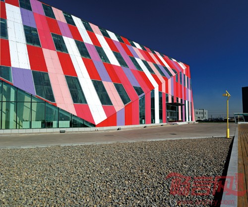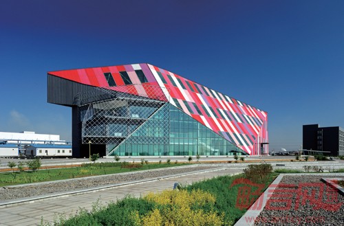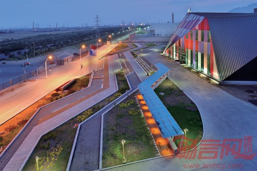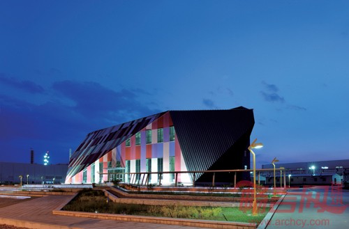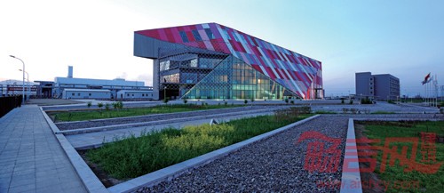 本建筑设计从建筑室内空间需要和造型出发,结合企业产品特点,将多晶硅矿石的造型和现代化的审美情趣结合,打造出别具一格的建筑空间体验,利用太阳能节能环保企业特性,将生态建筑的概念引入建筑设计当中。建筑周围,选用当地原生植物品种:虎尾草、柴叶小檗、金叶莸、金露梅、火炬树、沙棘等,使整体景观随季节不同产生变幻。折线台地,既解决了建筑入口高差的问题,也在钻石造型前形成了一个诗意化的“托盘”。