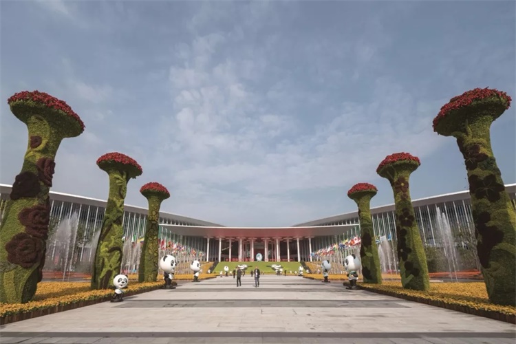 12万㎡的南广场有序地排列了50余棵12m高的大香樟,高低有序的层次感凸显树阵气势;入口两侧矗立着的8根8m高的迎宾花柱,采用江南青花瓷瓶的造型,表面用浮雕手法,以绿色植物及彩色花卉勾画出八大名花主题;草地上密集摆放的金黄色盆花形成了气势宏大的花海;位于广场尽端的入口处近200m宽的大台阶上,以各色花卉拼出体现进博会的主题画卷作为背景。平台中央设置本次进博会会标,两侧中英文“中国国际进口博览会”字体雕塑形成整个广场的视觉焦点。
