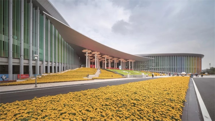 南面主入口广场以秋季为主题,以黄色花阵体现出金秋的丰收与缤纷色彩,主入口门廊24根圆柱表面渐变穿孔、內透LED光,体现二十四节气与节日气氛,其光与色平时也能随四季歌的音乐变幻。南广场通过花海、水景及一组8根龙泉青瓷甁形象的花柱寓意江南水乡美景。南广场的花柱饰以牡丹、玉兰、梅花等八种中国代表性的花饰。花柱、进博会吉祥物、主会场与平行论坛室内的庑殿顶轮廓、祥云地毯共同彰显了中国元素。会议中心外部形态也神似白玉兰花的抽象图案,线条优雅舒展。整体的设计风格现代、柔和、精致、轻盈,体现出江南元素与海派建筑的韵味。