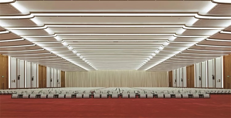 可容纳2 000人的主会场弥补了国展中心大容量会议功能的缺失,利用原有展厅有效拓展使用面积,以提升展厅的综合利用及安全保障,为室内设计打下基础。主会场室内设计采用了现代的设计语言,吊顶通过层层叠级的造型,表达了富有代表性的中国高级建筑形式——庑殿顶轮廓,以类似白描的形式展现“大国风范”。古铜色的大门上镶嵌了如同玉兰花瓣的抽象图案,增添了“海派韵味”。