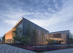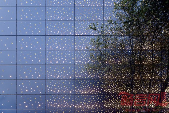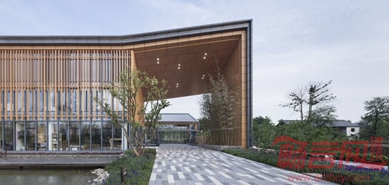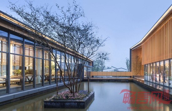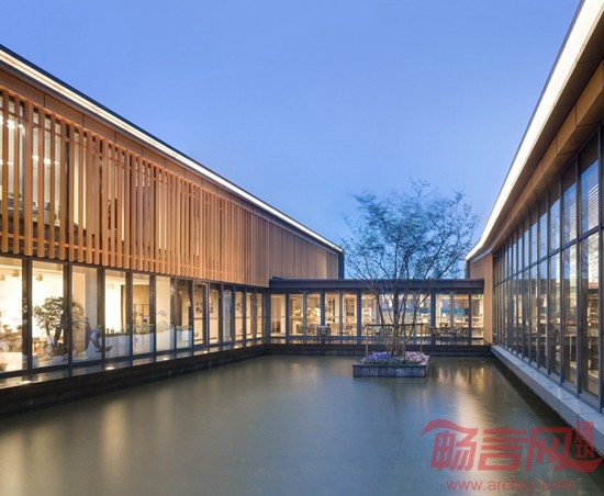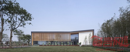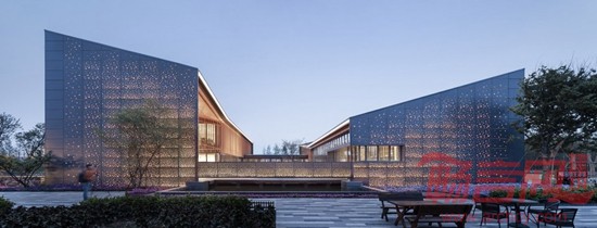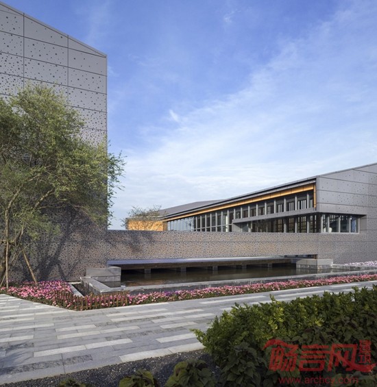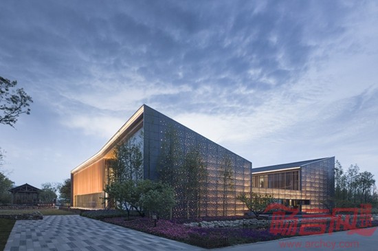 田园生活馆的设计目标,根植于阳山丰富的自然及人文资源,寻求新建筑与原有环境的协调共生,塑造根植于此时此地的建筑,为“当代田园”这一新型生活方式提供与之相适应的空间形态。田园生活馆的空间构成源于传统建筑的空间原型——庭园空间,而围合庭园的建筑南北通透、东西实墙。建筑的东西侧外墙设计提取了地域的象征元素——桃花,烘托“桃文化”主题,带来浓郁的地域文化气息。通过桃花图案的镂空铝板的运用,使建筑表情丰富且具有双重性:白天稳重不失细腻,夜晚则显得浪漫梦幻。建筑在对话传统和地域文化的同时,又体现了时代特征和元素。