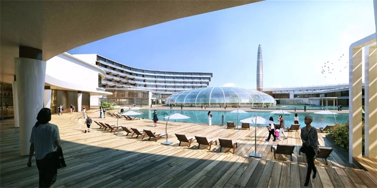 在祥云岛酒店规划设计中,充分利用海景优势,将酒店群放置于地块南侧,主要包括云龙度假酒店和产权式度假酒店群,共同凝聚核心酒店区,打造沿海度假休闲景观区;北侧靠近岛屿内部,主要利用地热优势和祥云岛的内湖景观,设计核心商业园区和温泉酒店群,打造旅游商业中心区;沿祥云岛内湖为大面积公园绿地,为度假人群提供休闲、休憩的天然氧吧。