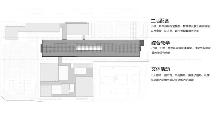 OPEN 事务所主持设计的文体设施,是一组具有当代园林空间特质的聚落式建筑,形式独特,是校园的形象和标志。而我们的教学楼设计则采用另一种截然不同的策略,它是一栋 200 米长的庭院的单体建筑,直率而简朴,它是文体中心的背景,也是场所的骨骼,具有强烈的基础设施的特征,不管是功能层面还是公共性层面,都展现了最大的容纳性和共享性。