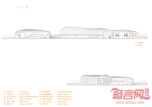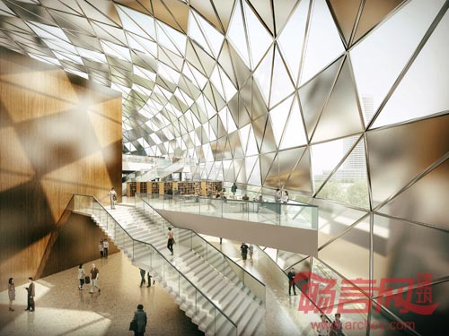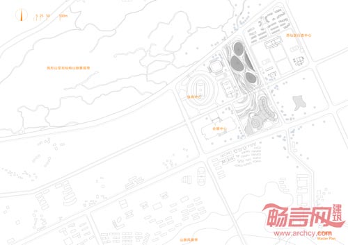 郴州文化艺术中心基地位于南北两条平行的山脉之间,坐落在郴州体育中心、会展中心、苏仙区行政中心之中,功能上包含五馆(美术馆、音乐厅、图书馆、科技馆、艺术馆)。建筑师将五馆按需求拆分成三个形状、大小各异的体块布置于基地之中,考虑文化艺术中心的公众性设置一个共享空间,将三个体块有机的串联。