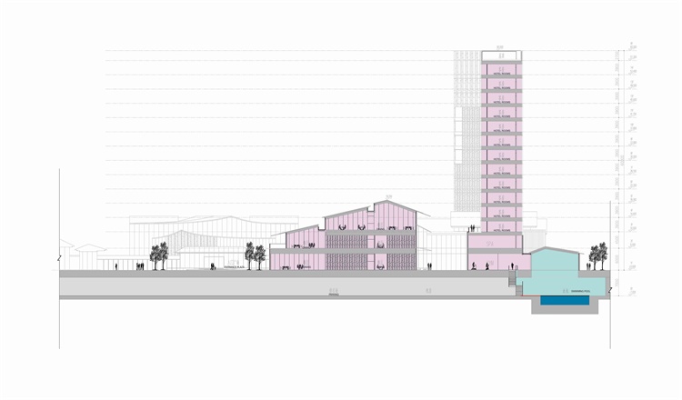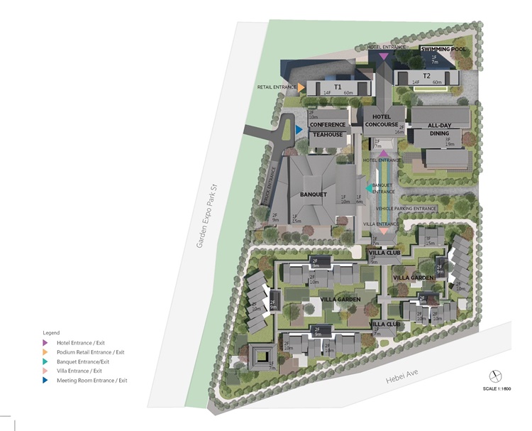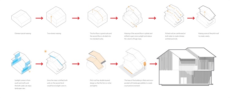 受古城启发,酒店的总体规划以南北为导向,两座中层酒店大楼与六十座别墅沿中心轴线垂直布局。两座酒店大楼置于总体规划的北部,共提供二百间客房,并采用了单边式走廊,饱览优美河景。传统建筑元素经重新演绎,遍布酒店内外,由外立面至客房内部皆贯彻统一。