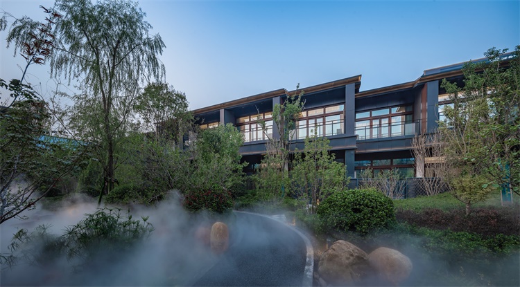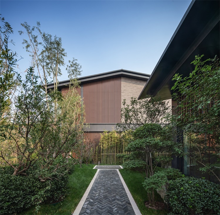 度假风的别墅体现了中国传统庭院的现代诠释。线条修长利落的双层别墅群面向中央花园,并沿地块周边园林布置。别墅群平移错落的排列,形成自成一角的私密空间,让访客尽情享受及放松。同时,别墅之间以流畅有序的庭院花园及有盖行人道连接,将户外自然环境与室内空间无缝连接,提供舒适开放的空间,让访客轻松游走恬静的私人空间和共享小区。倾斜的屋顶及标志性的梁柱呼应传统设计,突显统一的整体建筑设计,更与当地小区建立密不可分的联系。