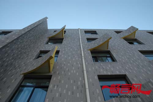 灰砖的色差设计与造型,分别由于居住者的不同:西三幢(男生宿舍),东二幢(女生宿舍)及(9层)高标宿舍而有所差别。西三幢以深灰色砖为主,跳浅色砖,东二幢以浅灰色砖为主,跳深灰色砖,高标宿舍则采用珠穆朗玛预制外挂板,深浅灰色组合。为了使建筑群体外观不至于过于理性化,逻辑化,西三幢阳台采用黄色跳块,烘托明快活泼的气氛,体现学生特有的朝气。东二幢花池采用外墙皮被掀起,体现柔美的特点。而高标宿舍则在外墙面饰黄色色块与之呼应。
