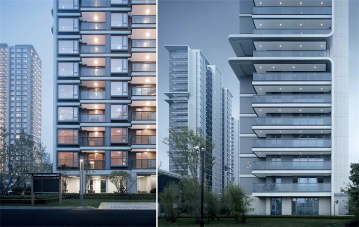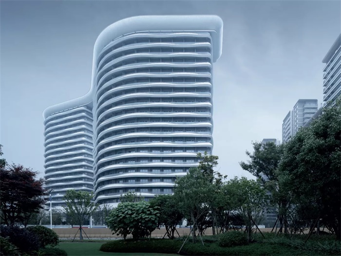 住宅整体效果突显公建化立面特色,利用弧形折板、“C”形飘板造型、大玻璃面等元素,诠释舟山独特的海洋文化,打造简洁清爽的、具有海洋风情的舟山滨海住宅标杆。每栋住宅的折板造型上下错动,起伏变化,展现出同一造型元素下的不同建筑表情,体现出“和而不同”的空间构建核心理念。该项目既迎合当下流行的现代精致、文化内涵丰富的居住理念,也契合对舟山怀有地缘情怀的居住者的心境。