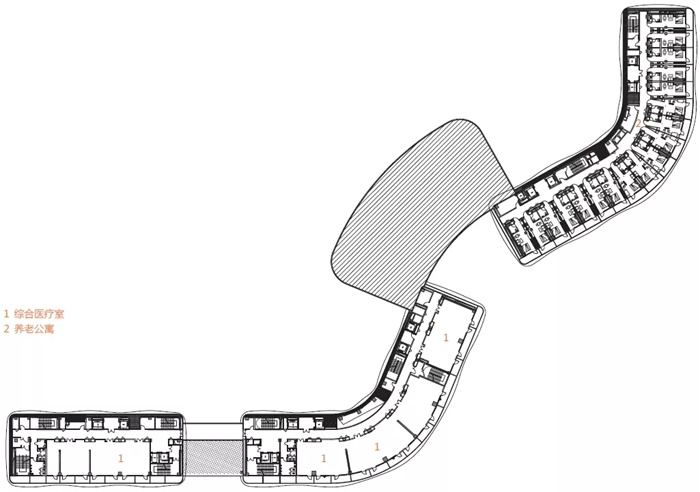 40-3地块养生养老公寓沿基地红线呈线性布局,充分利用基地独有的文化景观资源。其平面采用单廊布局形式,南房北廊,所有房间沿海岸线展开,充分利用普陀山佛光海景资源,打造一线海景观赏面,同时也保证了养生养老公寓充足的采光日照。