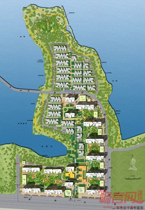 格林春岸项目三面环湖,是拥有极丰富水景资源的项目,在环湖泊岸的景观处理上,注重亲水性,对基地周边自然景观尊重是规划的构思起点。