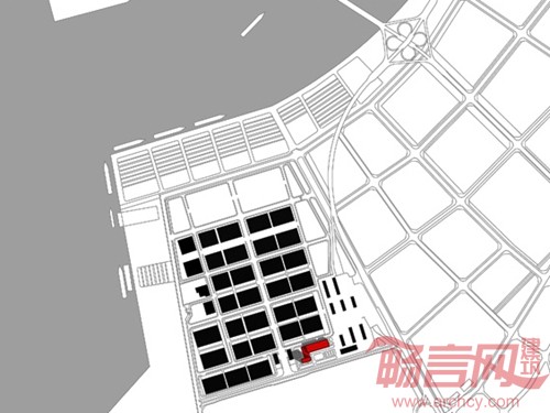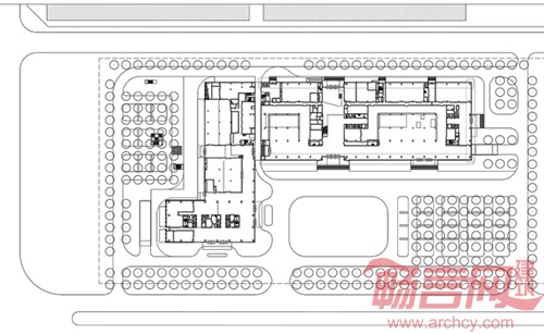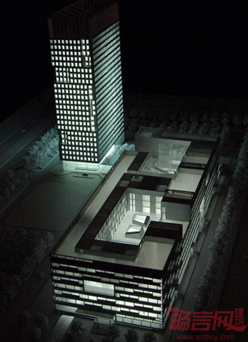 这样的场地条件,使我们萌生了将项目设计成在沙漠之中一片绿洲的理念。从使用功能上建筑分两部分,一是办文中心,一是出租写字楼。将两大不同的功能浓缩成简单的横向的办文主楼和竖向的办公塔楼,用L形方式布置,形成了一个有亲和力的生态广场,并能解决大量人流办理业务、停车、休闲、娱乐等问题。