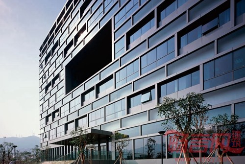 这种简单的形体处理,回应了园区周边并非人体尺度的物质环境,又与堆满集装箱的大环境有所契合。广场上种满大树,主楼主要入口处布置大面积水池,以改善基地炎热干枯的恶劣环境。建筑与货柜车道路间成片的树林不仅能为外部人流进入这片区域增加一道空间层次,同时对隔绝噪音非常有效。同样的景观概念还延伸到室内中庭、穿插在大楼中的一系列庭院和屋面,使这片淹没在货柜沙漠中的办公区域充满了人文关怀。