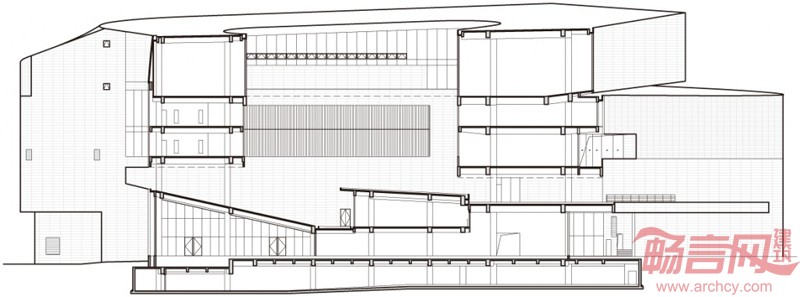 在建筑内部,盘旋环绕的建筑形体围合出一个由美术馆、印刷工厂、办公空间、底层公共空间等多个部门共享的空中花园。作为独立于外部不利因素的企业内部环境,在空间组织方面,将美术馆从公共属性的功能部分分离,与企业总部并列,独立地悬浮在景观资源最好的顶部,形成空间效果独特的独立艺术空间。这样的处理与流线的安排紧密相关,最终形成了能组织不同人群、不同参观方式的具有多选择可能性的内部丰富流线。