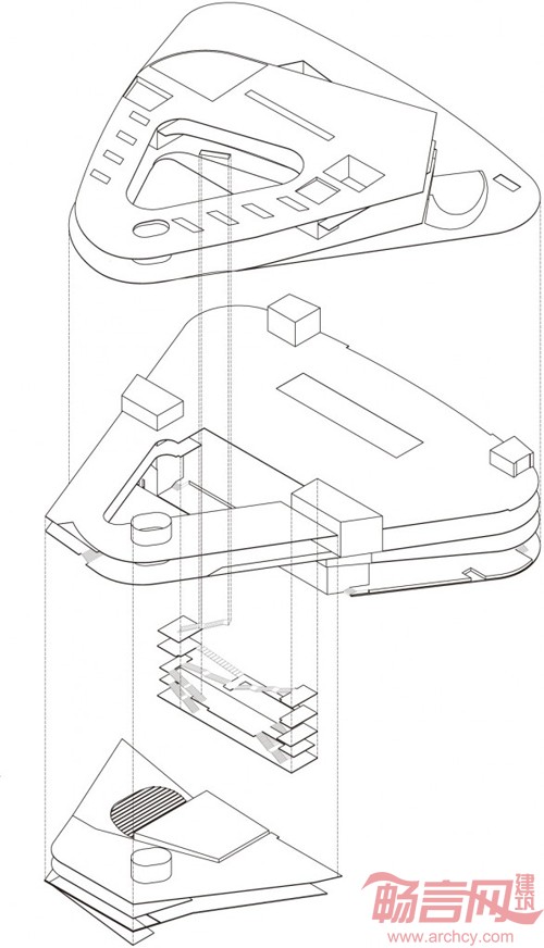 基地位于被三条高速公路包围的城市边缘,周边的建设环境依然处于规划过程当中,具有相当的不定性。为了不被这样嘈杂、混乱的环境淹没,建筑注定需要率先成为定义这个区域的标志物。毗邻的三条高速公路,决定了建筑形体应以一种完整和连续的姿态,与大尺度的城市基础设施之间形成对话。将建筑体量做整的同时,又必须考虑如何消解巨大的体量。一方面,在保证完整和连续表面的前提下,裂解出实体面之间精致的开阖关系,为地面行人创造近人尺度的视觉感受;另一方面,在基地一端退让出一块三角形区域,改善周边的城市公共环境,从这个视角,建筑在每个侧面的表情各不相同。