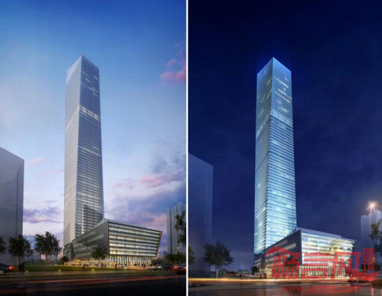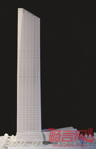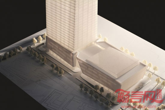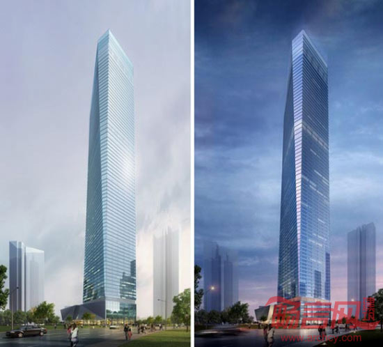 水岸国际中心立面由塔楼和裙楼两部分组成。塔楼体量从下至上逐渐用曲线收分,向地块最重要的环境特征——汾河做出呼应的姿态。整个塔楼标准层由长方形逐渐演化,渐变到顶上的梯形,跟南侧摩天石住宅楼产生呼应。东立面也以凹曲线的轨迹向上微微收分。西北角和东北角从最高处开始切削,一直到塔楼底部,形成两个与楼通高的三角形面,增强塔楼的几何性和挺拔感。与塔楼的“虚”体量对应的是裙楼的“实”。裙楼主体由几个折面体块构成。由石材格栅形成的两组折面将裙楼体量包裹。裙楼朝着滨河西路的方向用剖面呈折线的玻璃体量,加强标志性。裙楼整体与塔楼一起,共同形成了极具标志性的水岸国际中心造型。