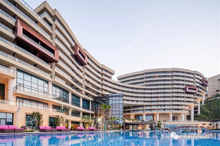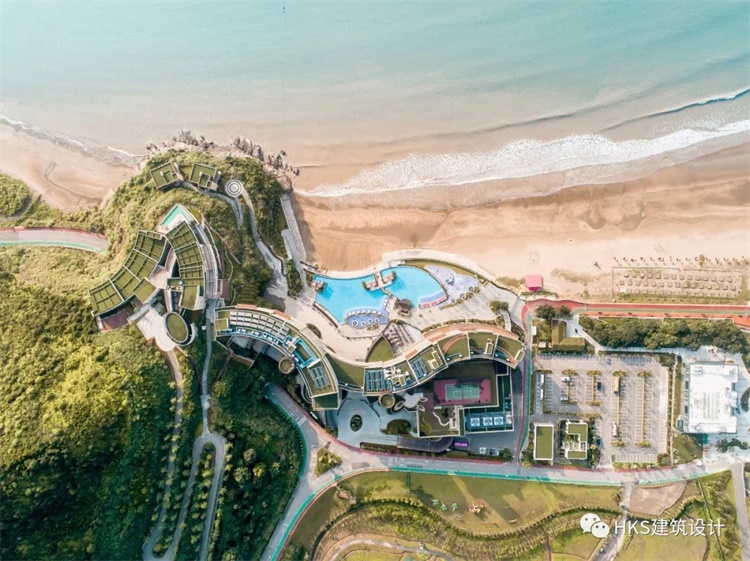 酒店牢牢地抓住了这块场地独一无二的自然天成之美。大自然的鬼斧神工让我们设计的酒店同时拥有海滩和山地的体验….两种截然不同的感觉 - 目的地之中的目的地。立面的处理上为了避免水平线条的单调,无论是面海一侧的金属套框,还是面山一侧的核心竖筒,再加上大堂及山顶会所的玻璃幕墙,都将立面点缀得更加活泼。酒店入口落客区形成了一个巨大的视窗,可以让客人第一时间体验到大海的气息。从如绸的水幕墙,到如镜的泳池,再到远处无垠的大海,水的体验连成一体。