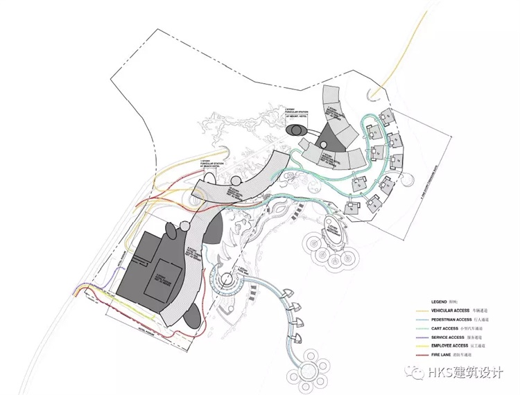 整个项目大致分为海滩酒店和山地酒店两部分,各自形成不同的居住体验。海滩酒店均为单走廊布置客房,弧形的曲面既展现了流畅的线条,又增加利用了场地的宽度延展,实现了海景客房数量的最大化。山地酒店则顺应地形,充分利用了270度的视角,将突出山体两侧的海滩尽收眼底。