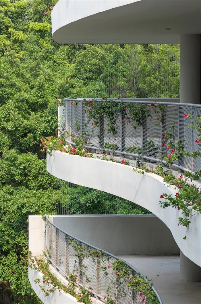 由于用地的局限,我们也意识到有必要把绿化引到建筑立面上,于是用钢丝网作为每层开敞空间的栏杆扶手材料,便于藤本植物攀爬。
