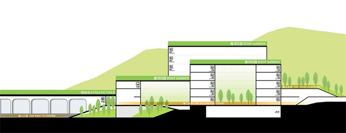 选择了作为山与城的友好衔接的设计策略,学校建筑成了山体伸向城市的阳台。建筑在多个台地上架起、连接,整体校园形成一个具有充分可达性的观景平台群,在坡向城市的山脉西侧,不同标高的屋顶平台,适合远眺,也适合对望。运动场是最大的平台,其承接山脉、俯瞰街景,宽阔的视野与充足的阳光吸引孩子们来这里活动,既可沉浸绿色,又可观察城市。