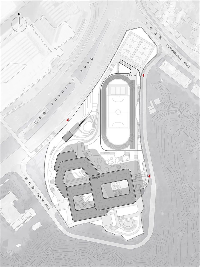金榜广场的对面,绿色屏障郁郁葱葱,山体连绵,新的建筑群置身其中,将以什么样的姿态呈现?视线由远及近,由高到低,它们应该成为山体的一部分。设计团队选择了相对集约的形态策略,建筑主体藏入山坳,依山就势、错落连接,将原来山坳一侧的陡直化为有节奏的退台;沿着入城山脉的西侧,运动区建筑体平铺般倚山面城,用长而低的体量护住山体,延续其平缓的趋势。