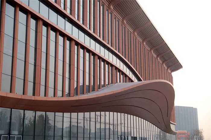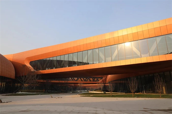项目由北京建院(联合体牵头方)+扎哈·哈迪德建筑事务所设计。建筑的构造呼应了展馆、会议中心和酒店之间的一体关系,由一系列相连的线条和几何图形精心构筑而成,其灵感来自于中国传统建筑中琉璃瓦屋顶的纹理。同时,古铜色的色彩基调和外皮的巨型凹槽开窗更是给展览中心的二期空间增添了动感与活力。