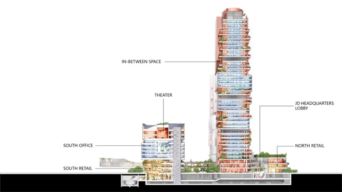 设计包括两座塔楼和与之毗邻的城脊,总面积达约十八万七千五百平方米,涵盖办公、酒店、商业和文化空间。城脊顶部是文化场所“京东中心”,内设有剧场和展览空间,向公众开放。塔楼下方为共享裙楼——“京东世界” ,这里将成为举行各种文化活动的场所。凭借其综合功能和策略性的空间布局,“画境之城”旨在与周围环境和谐共生,并通过其对城市文脉的融入激发城市的活力。