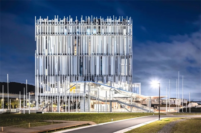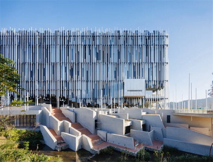 设计团队巧妙地将自然与人工元素融为一体。其独特的外观由一系列高低错落、长短不一的喷砂铝管与垂直分割的三色铝板交错排列而成。从远处看,这线性的屏幕宛如风中摇曳的芦苇,模糊而美丽,它巧妙地在外墙上反射出不断变化的自然环景观,以其独特的建筑外观吸引着人们,使人们能够体验大自然瞬息万变的美景。