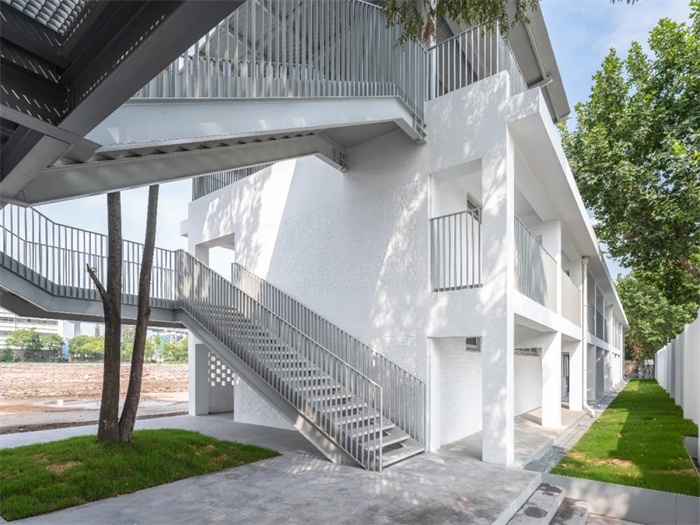露台下的钢柱与水杉树干伴随着透过格构钢板的点点光斑相映成趣,南侧疏散楼梯上也为保留的构树留出孔洞,这些都在规则的布局中接纳了场地的偶然性。