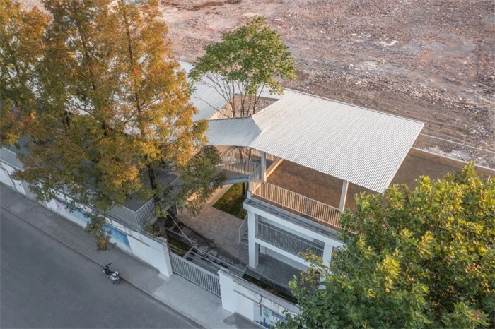 设计团队通过结构加固后改造利用单跨混凝土双层框架结构的自行车库。全部保留场地内有 12 株经年高大乔木,并能留给将来的楔形绿带。