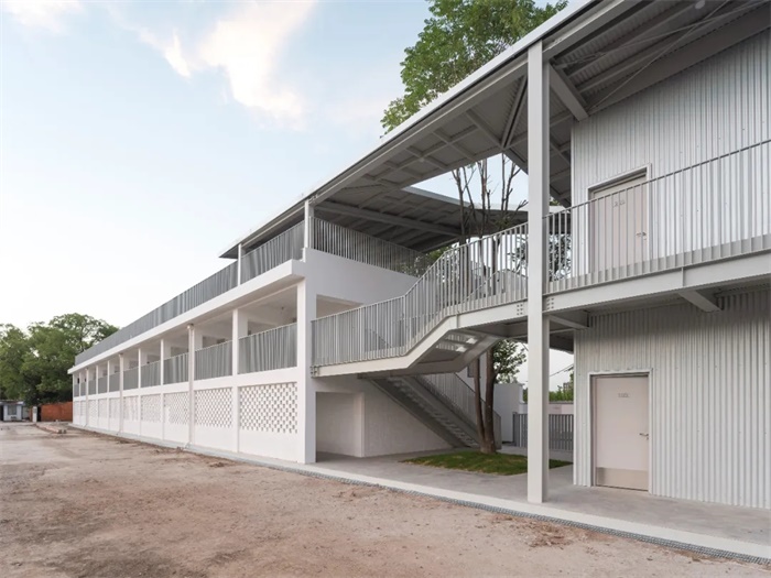 办公楼与服务楼采用银灰原色波纹镀铝锌钢板的轻钢单坡屋顶。新建部分的外墙也全部用原色波纹镀铝锌钢板包裹。宿舍楼的围护墙体采用页岩砖砌筑,底层外廊西立面加了镂空花格砖墙。