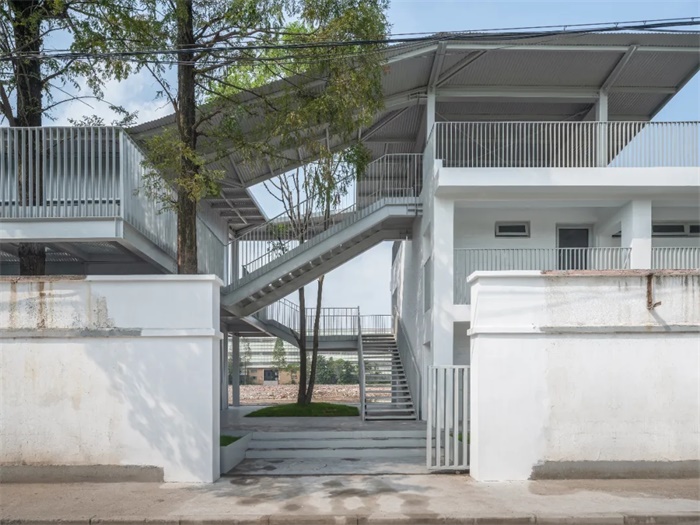 中部和南端分别为新建的六开间办公楼和四开间服务楼。宿舍楼和办公楼之间围绕保留的栾树形成两层通高的主入口开放中庭,屋顶留洞让栾树穿出,围绕栾树设置回旋三跑钢梯将一层和两栋错层的二层、以及宿舍楼天台连接起来。
