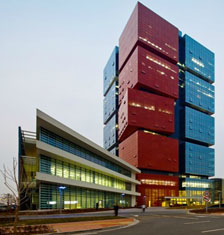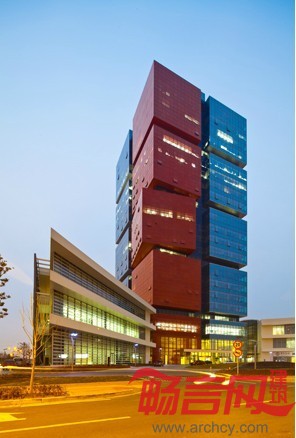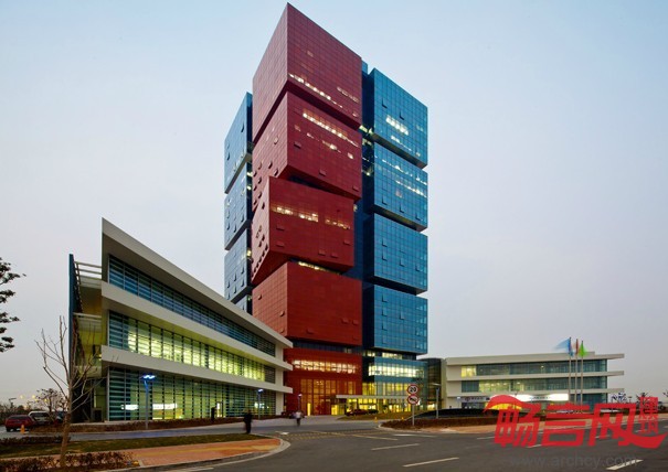 在项目伊始,大厦的设计目标就被确定为“反映物流的运作建筑”。塔楼被分为一系列上下叠加和左右排列的玻璃盒体,这些玻璃盒体带有“集装箱”的隐喻,从柔和的晨光到辉煌的日落,幕墙的反射玻璃将不断对大气和气候的条件作出回应,在一天中呈现出丰富多变的面貌。每一个玻璃盒体都具有四层的高度,玻璃盒体间通过一层高的凹入进行分隔。位于西南角的红色玻璃盒体成为沿现代大道东西向行进时最为瞩目的视觉特征,其中一个扭转的盒体暗示了入口的方向。同时,玻璃盒体的铝合金底边及天花趣味性地以旋转交替的方式点缀以蓝色和红色这两种不同的色彩,增强了建筑的导向性和挺拔感。