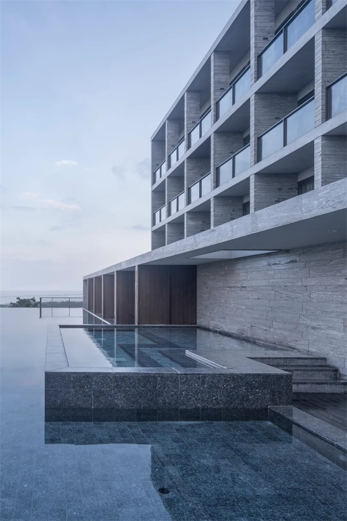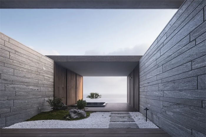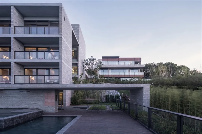 采用质朴的建筑材料,如:毛石、青灰色石材、混凝土涂料、栗色竹木等,控制建筑色调,使立面与树木山林融为一体。