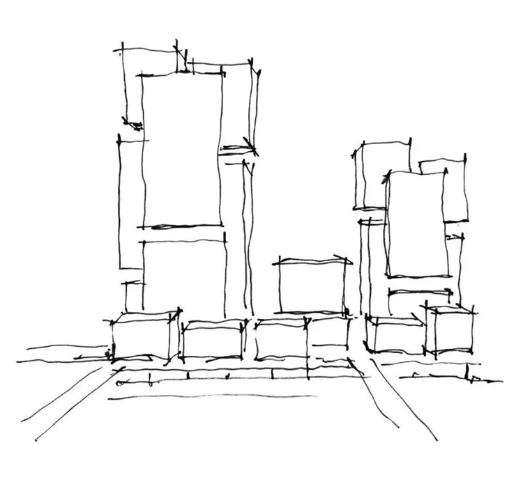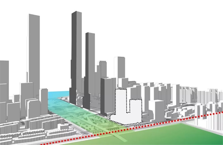 基座景观平台被划分为较小的组团,由不同大小的建筑体量构成。裙房底层沿街空间将用于商业零售,与二层公共的漫步休闲平台共同营造了一个开放的街区。在交错的路口处,街道被扩大为广场,由此形成多变的空间序列。这些广场、街巷和路径在漫步平台层定义了城市特色风情,通过人行天桥与“中央公园”以及相邻地块交织形成步行网络,从而刻画出新的城市空间。