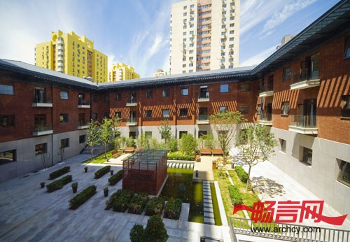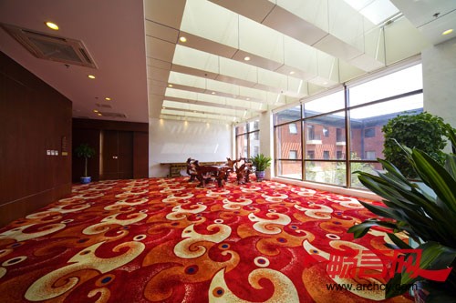 在旧建筑的有限空间里改造,满足现代商务宾馆的使用要求;在现代设计风格中加入传统中国文化要素,提升宾馆的文化内涵;在白色基调中大胆运用红色、黑色,创造浓烈的色彩对比;在围合空间中增加庭院的景观,与红砖墙、坡屋顶相互呼应。