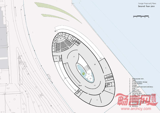 1、内部:做成一个外部沿海的休闲空间,内部为展览空间,像蛋清与蛋黄一样结构,内部参观人员休闲时有好的视觉景观。同时内部的庭院空间不仅为集会提供场所也为博物馆内部的自然采光提供可能。