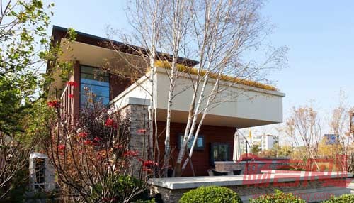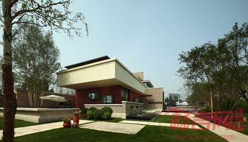 售楼中心建筑设计意向源于建筑大师赖特崇尚自然的有机建筑观念,将建筑作为环境的基本组成要素进行设计。售楼中心在体现“北美风情”的同时,也显现出一种隐約的“师法自然”的東方印象,线条简练,流暢明快。