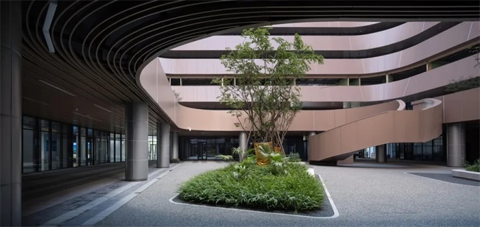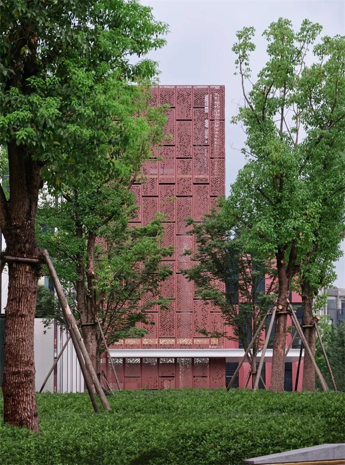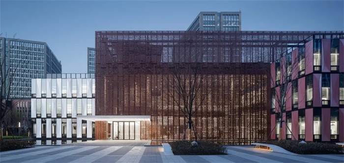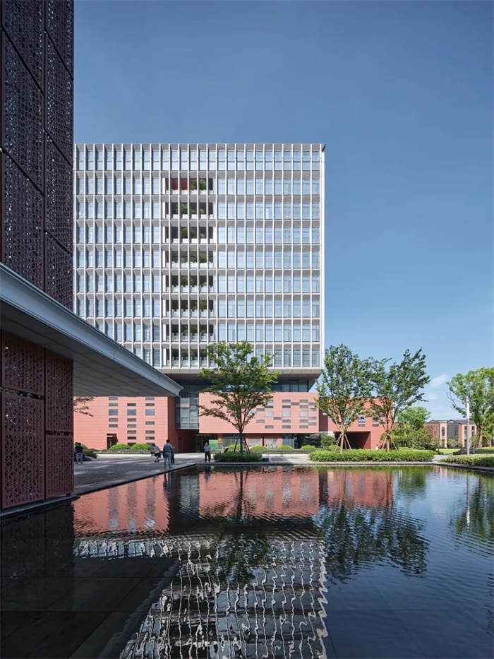 整体建筑群既需要体现现代园区的科技感和时代感,又希望呼应浙江大学“求是红”的传统基因。为此,立面设计和材料选择上采用了上下分离的叠合策略,高层建筑部分主要采用了精致的铝板及幕墙体系,简约时尚,而下部近人尺度的裙房及独栋建筑群落则采用了红色陶板、清水砖等“浙大”元素,细腻优雅,实现了传统与现代在园区融合共生的设计初衷。